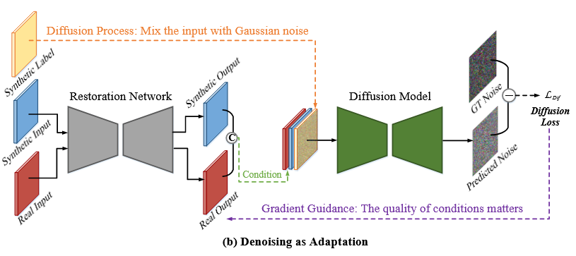 扩散模型的任务仍然是“预测噪声”,但在这篇论文里,它不再用来生成图像,而是作为一个“分布判别器”,通过噪声预测误差来引导恢复网络的输出在合成域与真实域之间对齐到干净域。